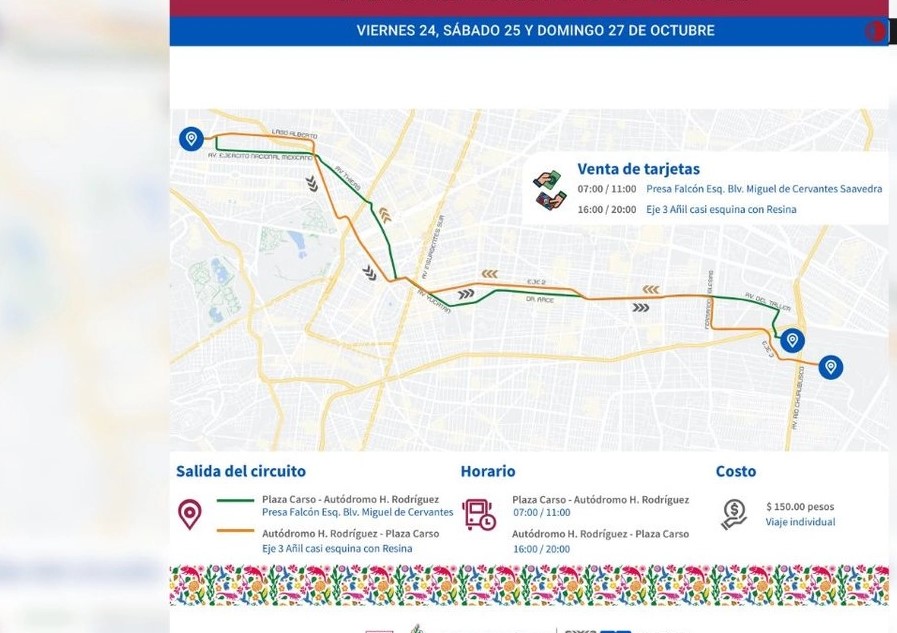 En tanto, el Servicio de Transportes Eléctricos ofrecerá tres rutas especiales de trolebuses: desde Estadio Azteca y Plaza Carso hacia el Autódromo, y un servicio interno dentro del circuito gratuito para los asistentes.
