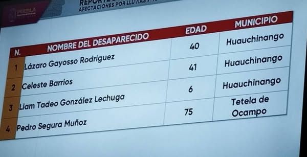 Puebla, Pue.- El gobernador del estado de Puebla, Alejandro Armenta Mier, dio a conocer la identidad de las 13 personas que han perdido la vida en la entidad debido a las fuertes lluvias y deslaves que se han registrado en la Sierra Norte y Nororiental de Puebla.