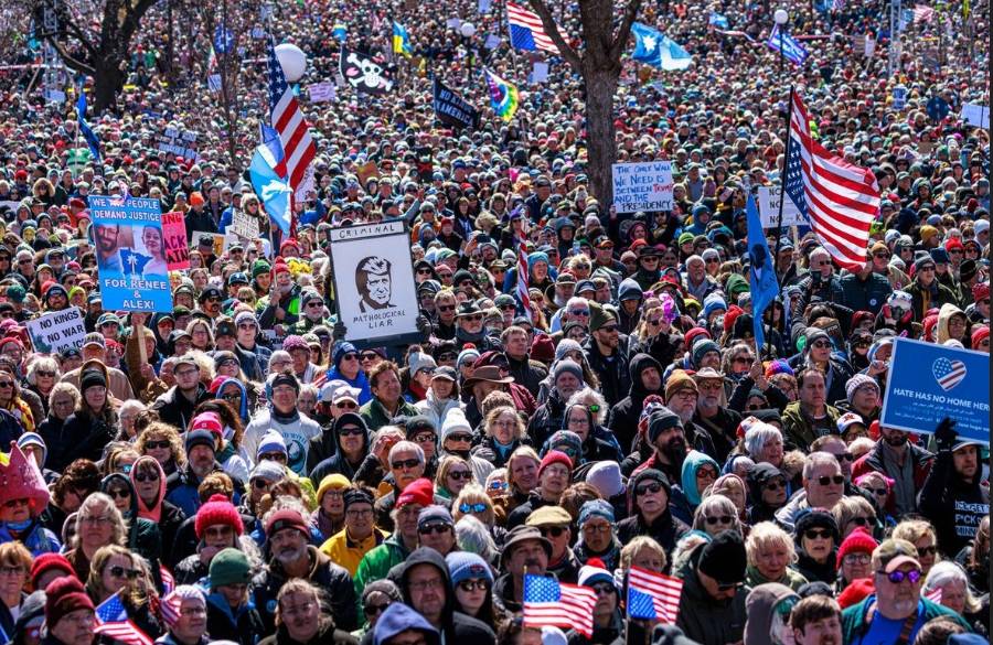En Mineápolis y Saint Paul, en Minesota, seleccionado como eje de este día de manifestaciones nacionales por haber ofrecido el mayor ejemplo de resistencia civil no violenta contra el asalto de fuerzas federales en operaciones antimigrantes en esas llamadas ciudades gemelas por el gobierno de Trump, unas 200 mil personas participaron, incluidos figuras nacionales como el senador socialista democrático Bernie Sanders, Bruce Springsteen, Jane Fonda, Tom Morello y el gobernador de Minesota y ex candidato a vicepresidente, Tim Walz, encabezaron el acto.