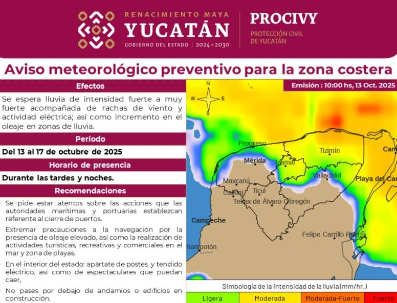 La Coordinación Estatal de Protección Civil (Procivy) emitió un aviso preventivo ante el pronóstico de lluvias fuertes a muy fuertes para los municipios de la franja costera del estado, que podrían estar acompañadas de rachas de viento, incremento del oleaje y actividad eléctrica, principalmente durante las tardes y noches del lunes 13 al viernes 17 de octubre.